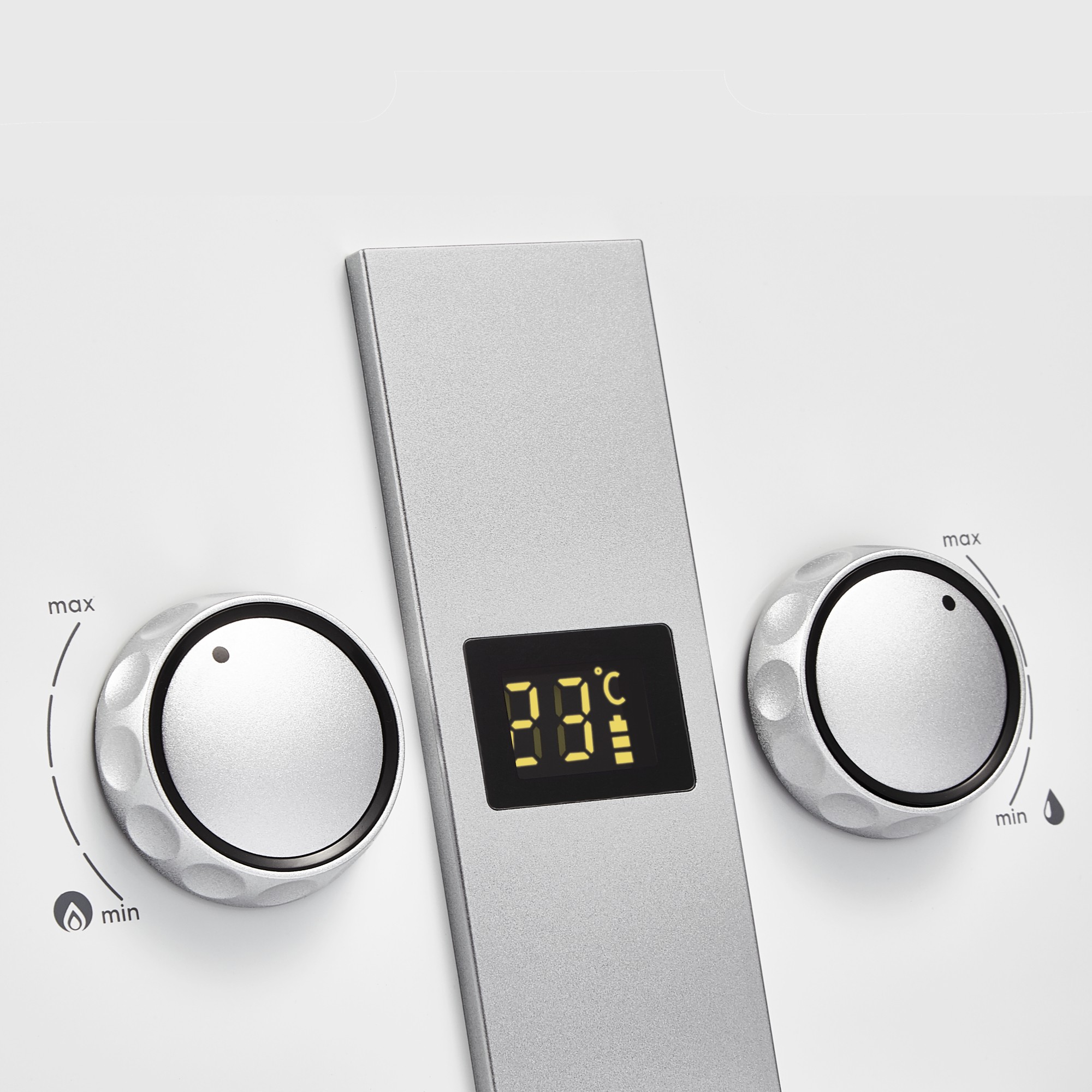 Для управления предусмотрены два поворотных переключателя: регулировка мощности горелки и установка температуры воды с точностью до 1°С. Они расположены на передней панели прибора. Уровень заряда батарей и температура воды выводятся на информационный дисплей.