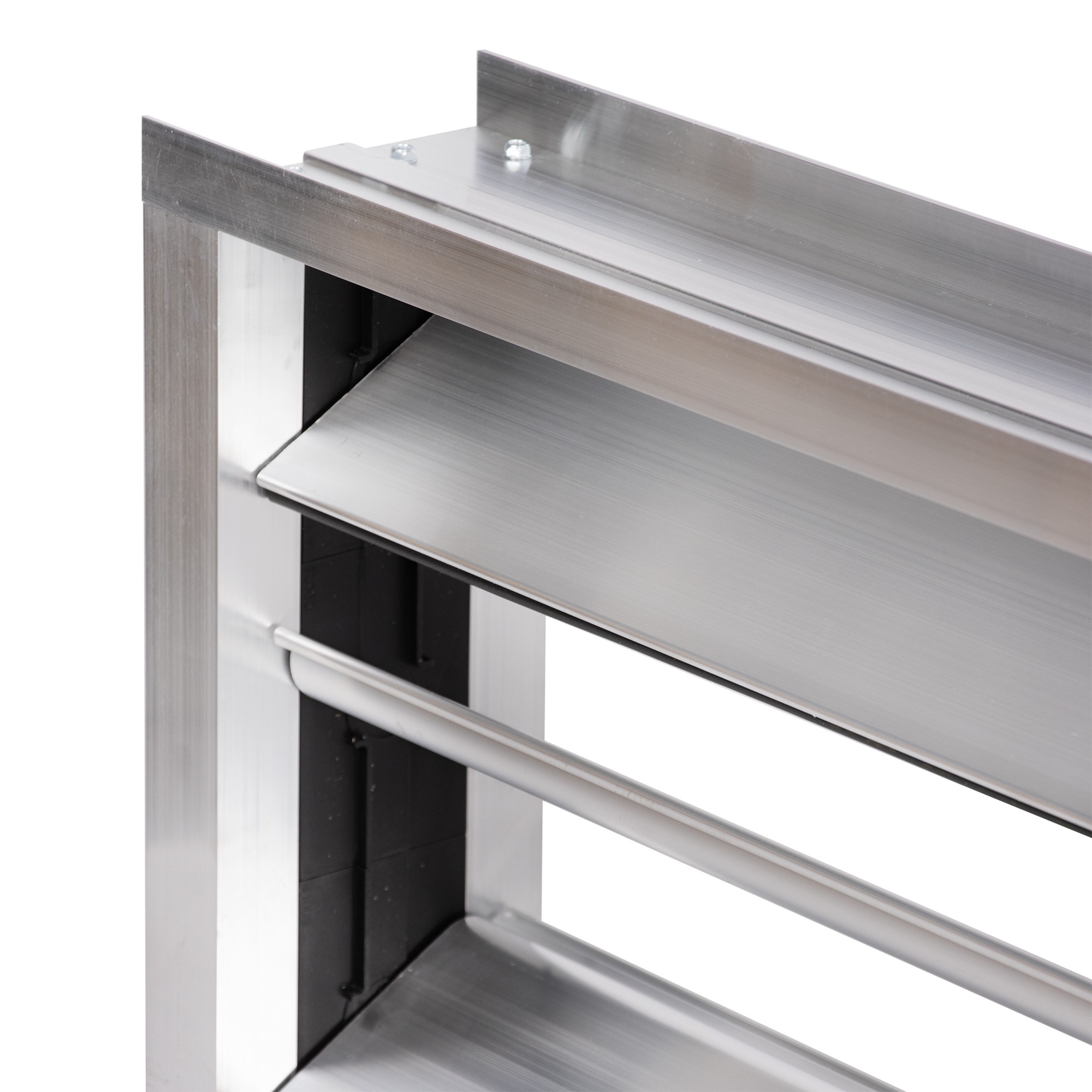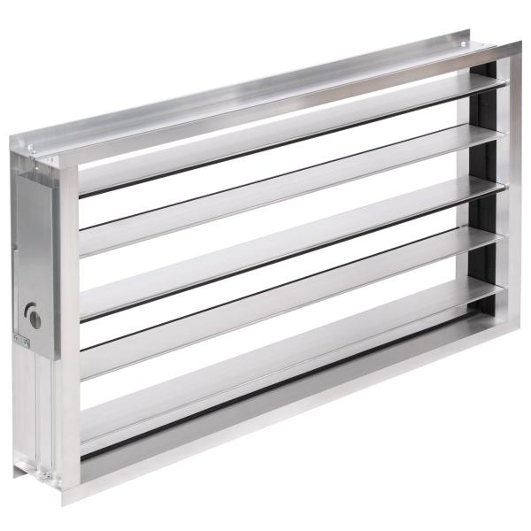 Клапаны изготавливаются из алюминиевого профиля, с шестернями, скрытыми внутри корпуса. За счет применения специального профиля высотой 150 мм увеличено проходное (живое) сечение в типоразмерах с высотой 150, 250, 350 и т.д. Герметичность клапана достигается за счет резинового уплотнителя, который установлен на каждой поворотной пластине. Клапаны оснащены квадратным штоком под привод. Ручной привод – опция.