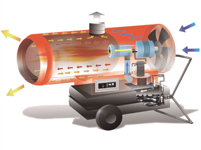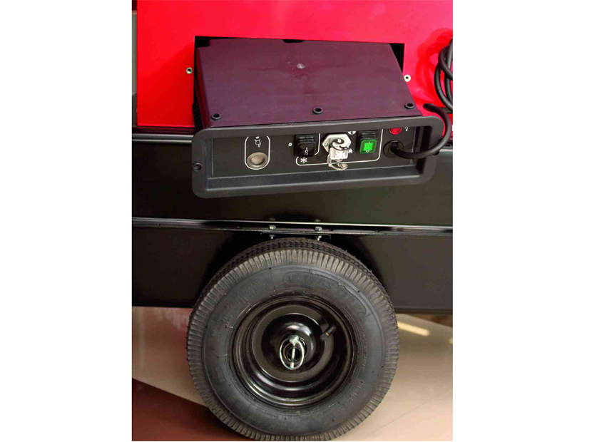 Блок управления с функцией самодиагностики и вместительный топливный бак позволяет длительно эксплуатировать прибор в автоматическом режиме (подключение выносного термостата, защитный термостат от перегрева, поствентиляция камеры сгорания, электронный контроль пламени и др.). Адаптер для крепления двух тепловых рукавов диаметром 400 мм дает возможность поддерживать необходимый температурный режим в двух помещениях одновременно. Мобильные версии нагревателей стандартно комплектуются пневматическими шасси с тележкой.
